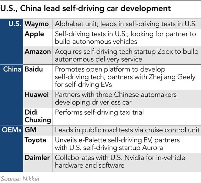 通用汽车旗下自动驾驶子公司GM Cruise;Waymo,起源于谷歌的自动驾驶汽车项目;中国的百度在加利福尼亚州和美国其他地区的公共道路上测试自动驾驶汽车方面处于领先地位,它们的距离远远超过戴姆勒或丰田。